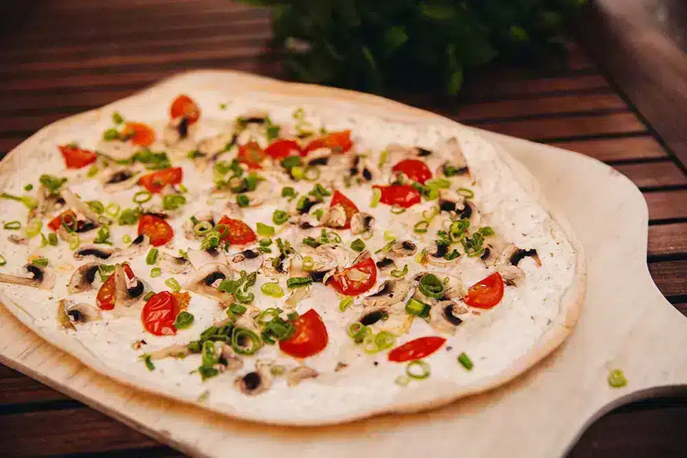 Unsere Spezialität ist der Flammkuchen aus dem Steinofen. Während der Sommer- und Herbstsaison decken wir in der Meisterstube oder auf der Sonnenterrasse ein.