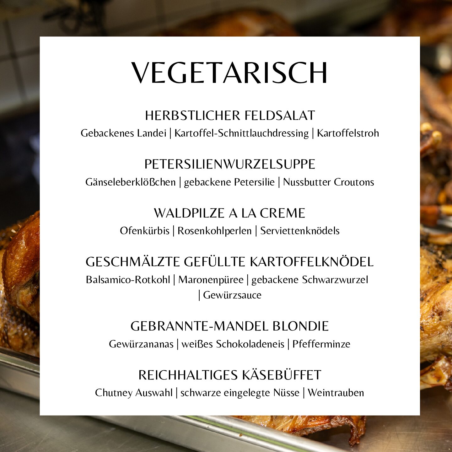 Freuen Sie sich auf die Heidelberger Bauerngans mit knuspriger Haut, saftigen Keulen, würzigem Rotkraut und kreativen Gängen – unsere Gänse stammen von unserem langjährigen und vertrauenswürdigen Partner Geflügelhof Ehrler. Auch vegetarische Optionen sind verfügbar.