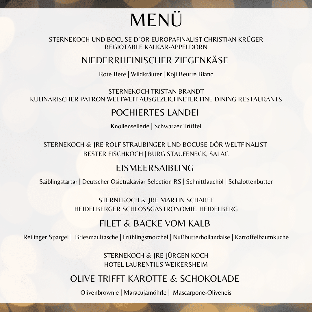 An diesem Abend bereiten sechs preisgekrönte Spitzenköche, allesamt Absolventen der Hotellerie – Schule, ein einzigartiges Menü, das höchste Kochkunst mit raffinierten Aromen verbindet: