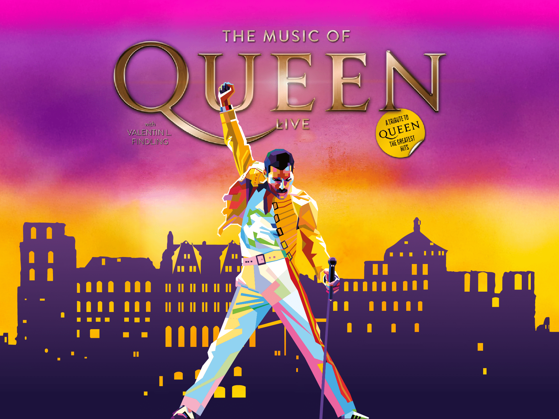 Die Show: The Music of QueenMit Songs wie Bohemian Rhapsody, We Will Rock You oder Radio Ga Ga bringt die Queen Tribute Band gemeinsam mit Valentin L. Findling die größten Hits der Rockgeschichte zurück – authentisch und doch einzigartig. Begleitet wird er von internationalen Top-Musikern, die bereits auf den großen Bühnen dieser Welt standen.