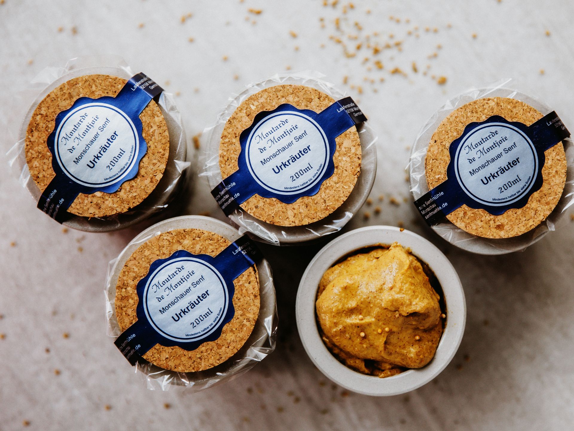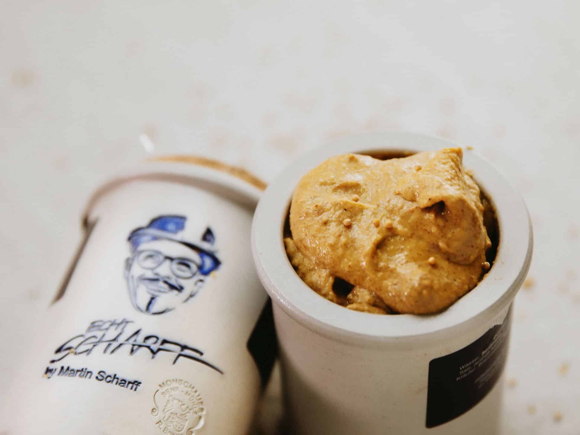 Der Senf im nostalgischen Steintöpfchen wird nach traditionellem Rezept in der über 100 Jahre alten Senfmühle Monschau produziert, frei von Geschmacksverstärkern und künstlichen Zusatzstoffen.