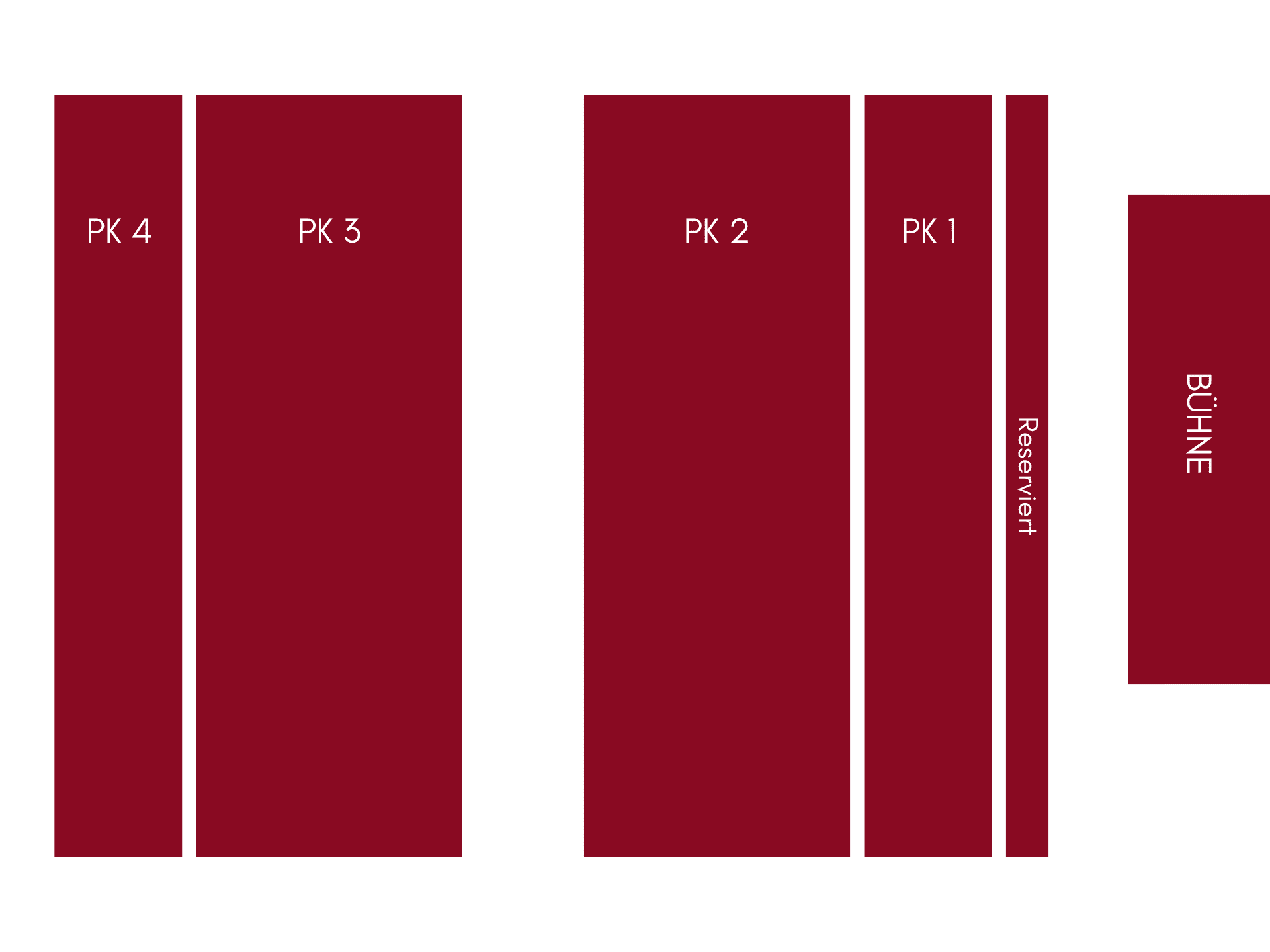 Für dieses Konzert gibt es vier Preiskategorien (PK 1 – PK 4). Bitte beachten Sie, dass innerhalb der jeweiligen Kategorie keine festen Sitzplätze zugewiesen sind. Sie können sich daher in Ihrer gebuchten Kategorie frei einen Platz aussuchen. Achten Sie jedoch darauf, aussschli8eßlich Plätze in der von Ihnen gewählten Kategorie zu belegen.
